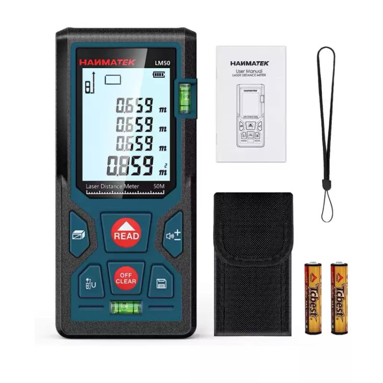 آنچه دریافت می کنید - فاصله سنج لیزری HANMATEK LM50. 2 عدد باتری قلمی 1.5 ولتی؛ 1 عدد کیف حمل؛ 1x بند مچ دست؛ 1x جعبه بسته. 1x1 x کتابچه راهنمای کاربر چند زبانه؛ 24 ماه ضمانت و خدمات دوستانه به مشتریان. (هدایای ایده آل شکرگزاری و کریسمس برای خانواده و دوستان)