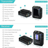 فشرده و سبک وزن فرستنده فقط 27 گرم و وزن گیرنده فقط 31 گرم است. اندازه کوچک به فرستنده اجازه می دهد تا به راحتی به پیراهن، یقه یا کراوات متصل شود. حتی اگر حرکت کنی هم نمی افتد. گیرنده را می توان با گیره پشتی روی دوربین سرد، سه پایه گوشی هوشمند و سایر پشتیبانی ها نصب کرد. مناسب برای ضبط صدا، مانند VLOG، ضبط ویدئو، مصاحبه، تبلیغات، یوتیوب/فیس بوک/تیک توک، پخش زنده، پادکست، عکاسی و غیره.